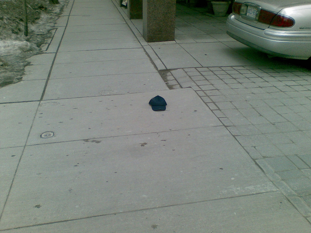 'Check it out, hat on the sidewalk. It's like an art installation. I'm taking a picture.'